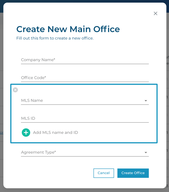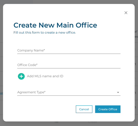 A modal will pop up in the middle of your screen asking for the Company Name, Office Code (Unique ID that will be used in their referral link and office admin link), and the type of agreement they are on.