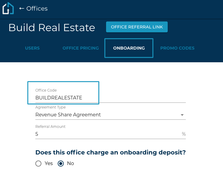 Click on the Onboarding tab where the Office Code will be stored. This code will then be placed in the login page URL, typically: