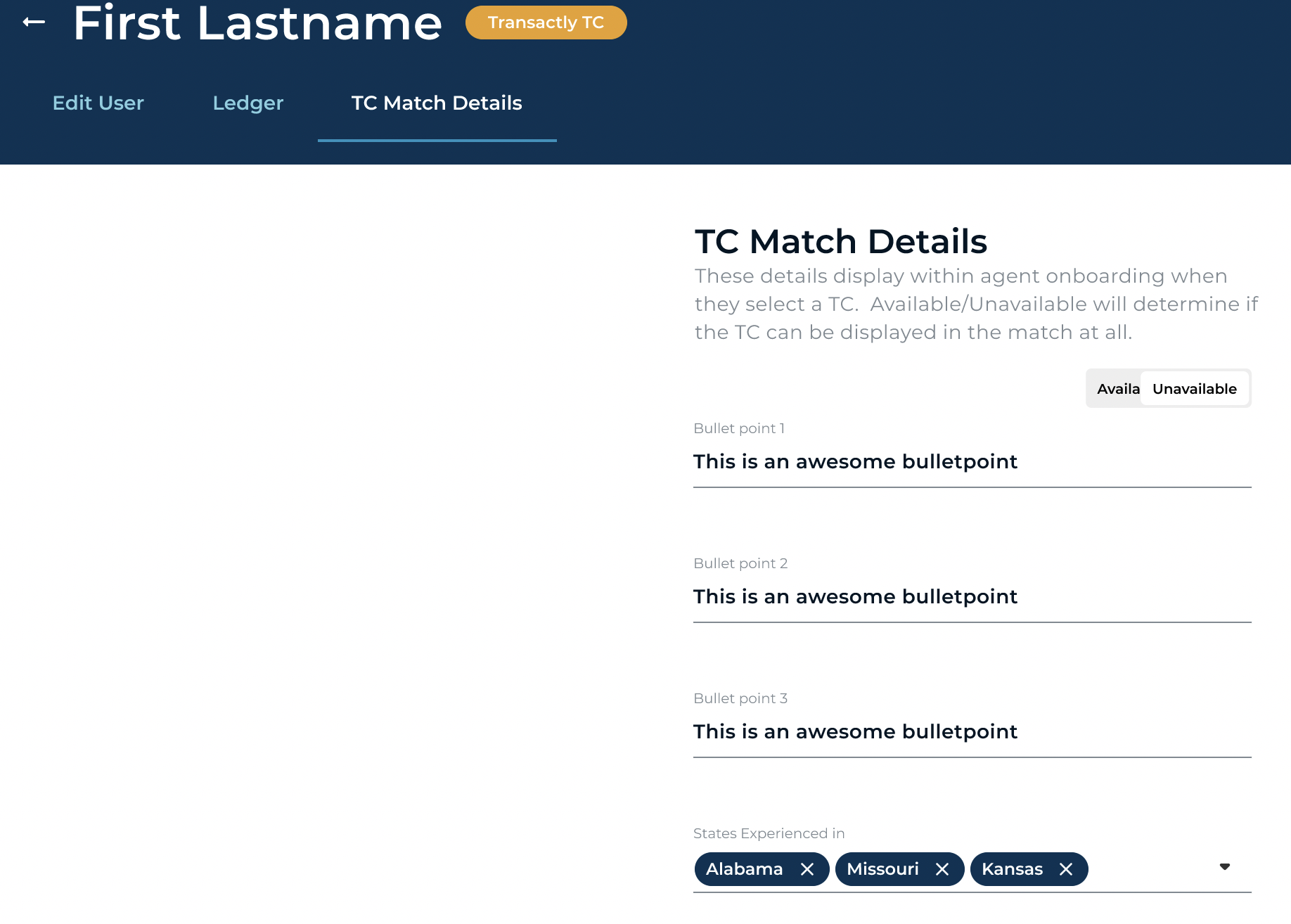 Navigate to the TC Match Details tab and make changes. The bullet points entered here are what will show for the client signing up to help them make their decision. Toggle the Available/ Unavailable for if a TC should show as an available option for a new client.