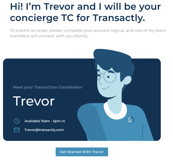 NOTE: If a TC is not available for the client's entered criteria, or if they choose the HELP option, they will be matched with "Trevor" and an email will go to TC@Transactly.com creating a ticket for TC Ops.
